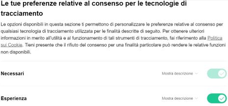 • Si aprirà automaticamente il pannello di configurazione personale dell’utente nel quale dovranno essere attivati e salvati anche i Cookie di “Esperienza” come da immagine seguente.
